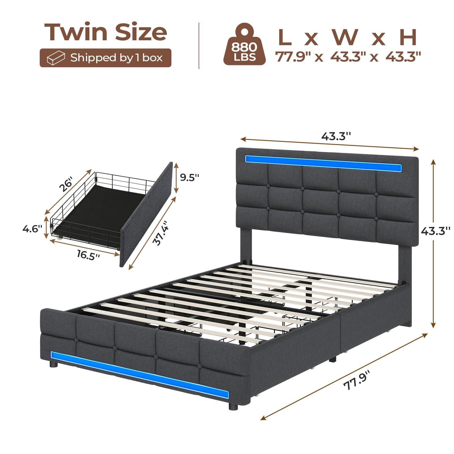 Linen LED Bed Frame with 4 Under Bed Drawers Dark Grey