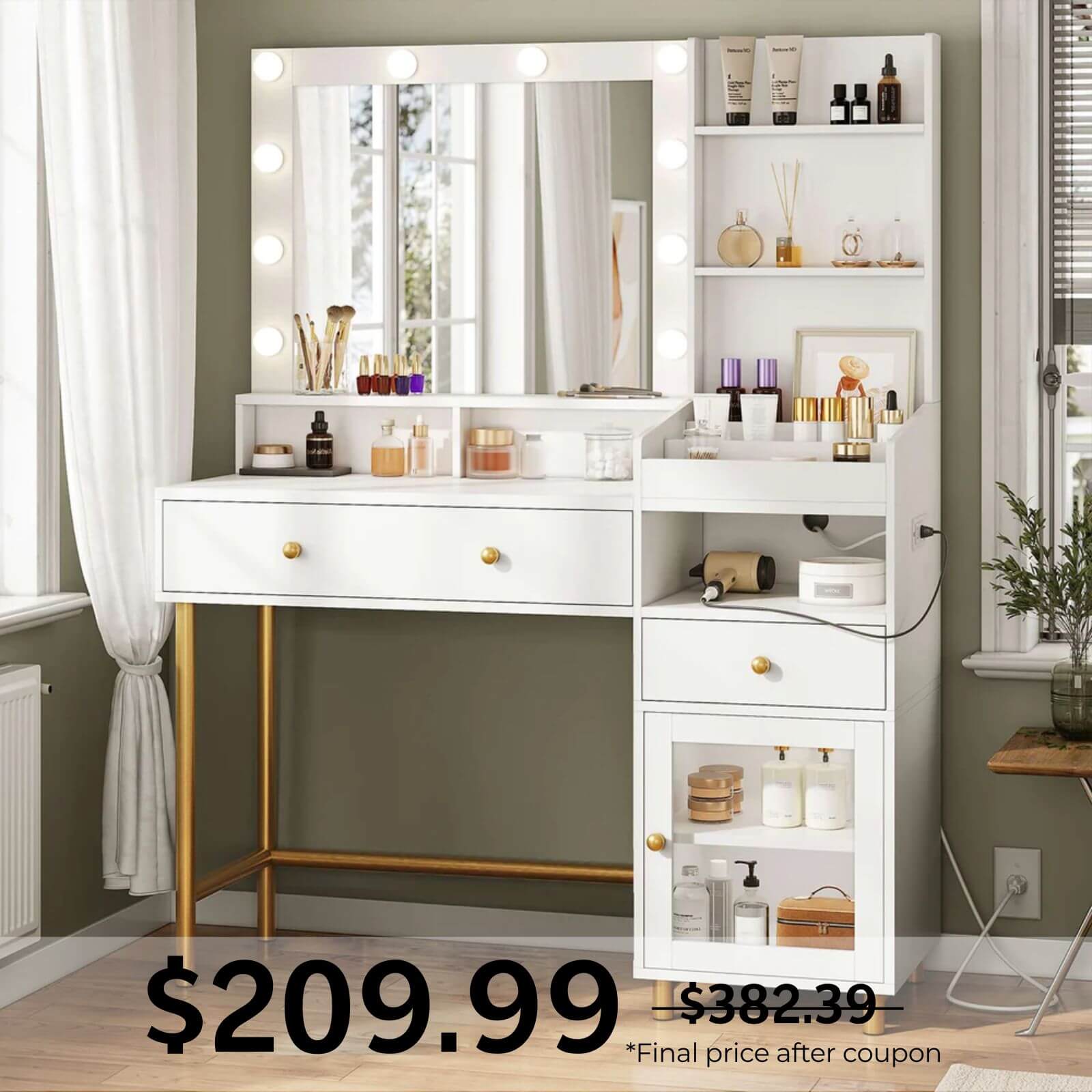 Are you still troubled by too many cosmetics and nowhere to store them? This vanity desk with mirror and lights contains 2 drawers, 4 shelves and 1 storage cabinet, providing enough space to store your makeup tools. Say goodbye to cluttered storage with the makeup desk with drawer. Overall dimensions: 37.8"L x 15.7"W x 56"H