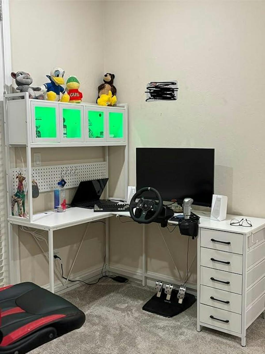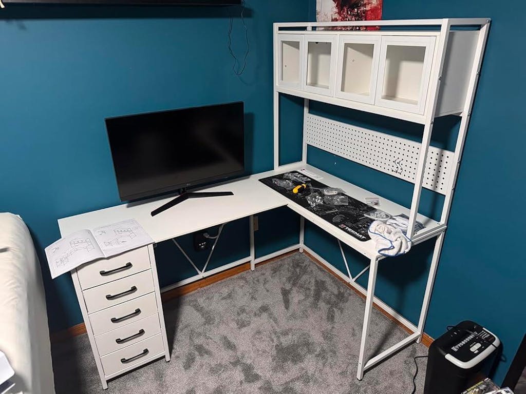 I purchased two of these desks, one for myself and one for my partner and we built them in two configurations then put them together to make a two-person setup. It's been great, and we've both been impressed with the desks. Everything came labeled and was easy to install, instructions were clear, quality is good, the cabinets + lights look amazing, it doesn't shake easily, there's plenty of space, and the drawers plus cabinets plus peg board plus hanging hooks means there's somewhere for all your things and trinkets.