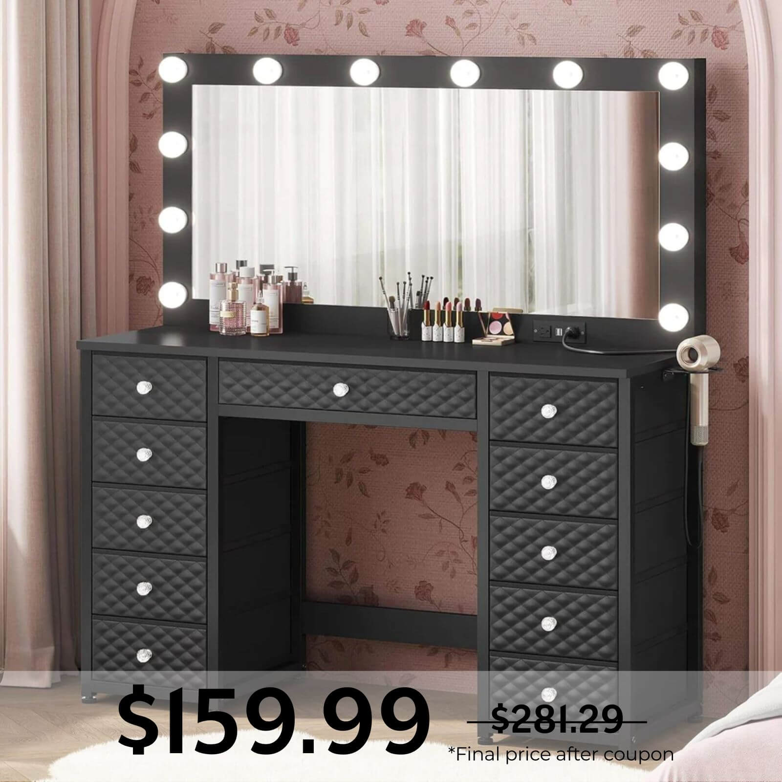 Makeup Vanity with 11 Drawers and Extra Large Mirror Black