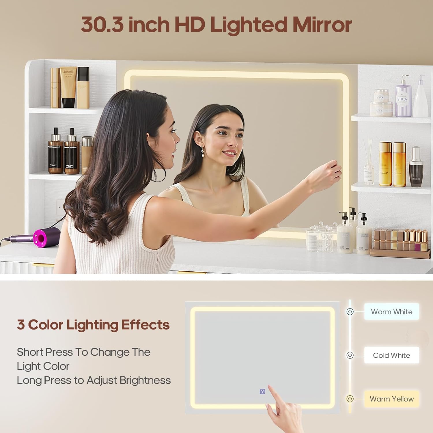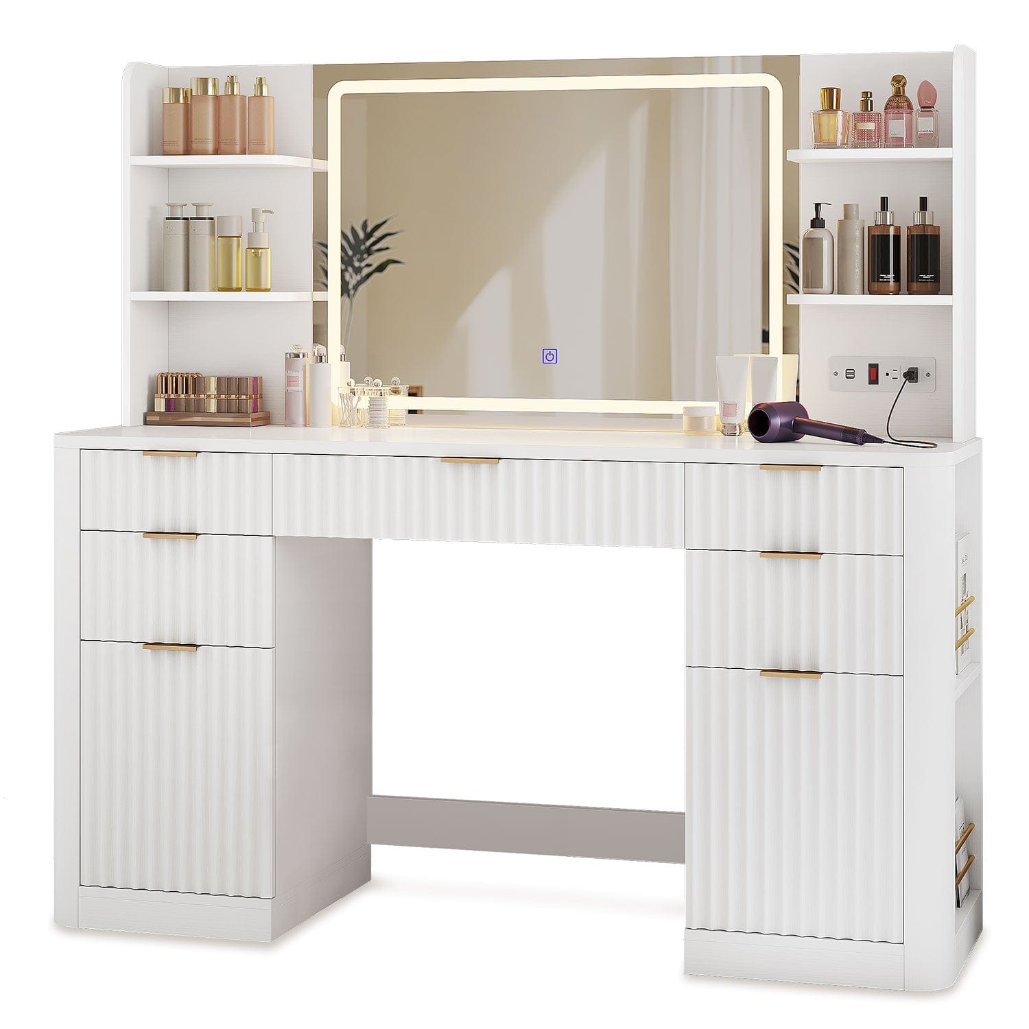 This 51.2" fluted vanity desk includes a generously sized 30.3" mirror equipped with adjustable lighting. Choose from multiple color modes and brightness levels to create the ideal illumination for makeup application, skincare routines, or styling—any time of day. The high-definition mirror offers a clear, wide view, helping you achieve flawless results in any lighting condition.