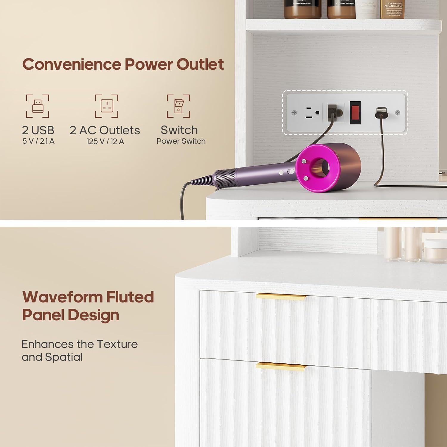 Featuring fluted waveform panels with soft wavy textures, this vanity brings a refined and chic aesthetic to your space. The delicate grooves enhance visual interest while seamlessly matching a variety of interior décors. Its timeless elegance makes it a wonderful gift choice for women and girls on special occasions such as birthdays, anniversaries, or Christmas.