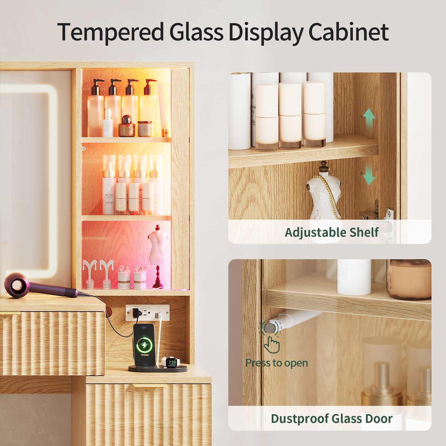 Organize your beauty collection with 8 drawers (2 top + 6 side) for makeup and skincare. Glass cabinets with touch-release doors elegantly display perfumes and collectibles, merging clutter-free organization with a museum-quality presentation.