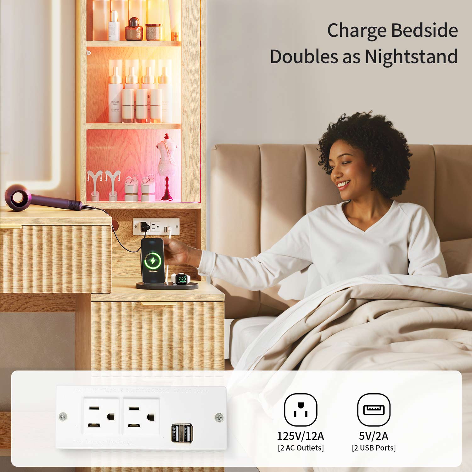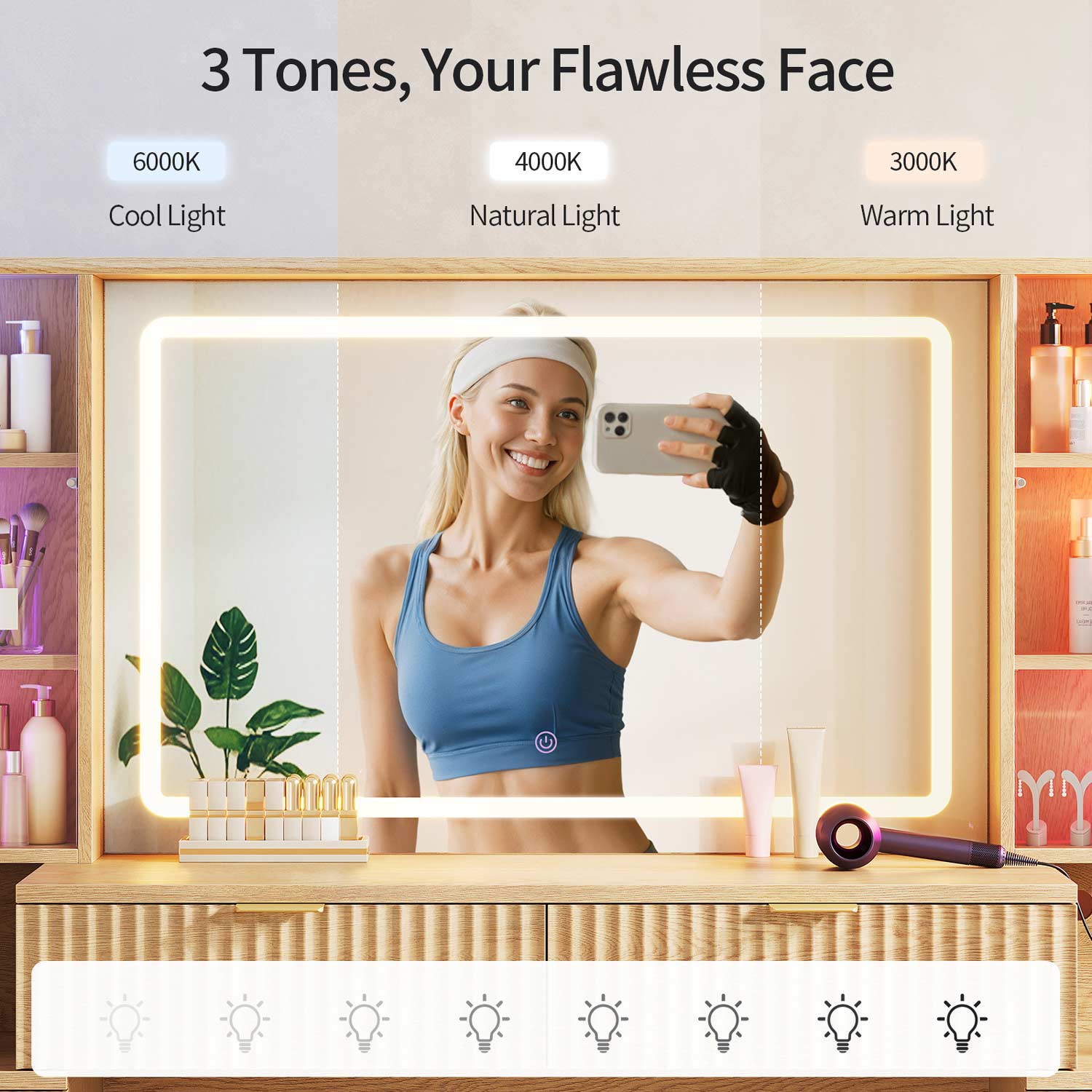 Achieve professional-grade makeup application day or night. The large HD mirror features 3 color temperatures and adjustable brightness. With 60,000-color, sound-sync LEDs that pulse to your music, it transforms your routine into a multisensory experience.