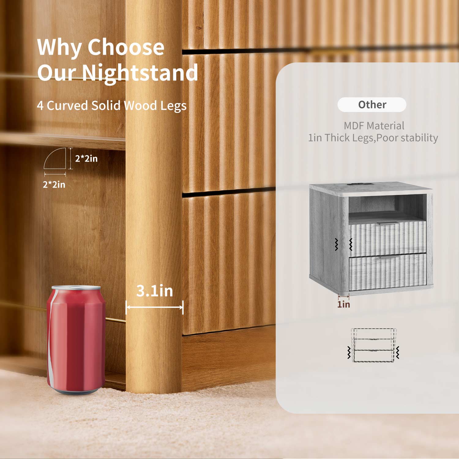 Fluted Nightstand with Charging Station Natural Oak