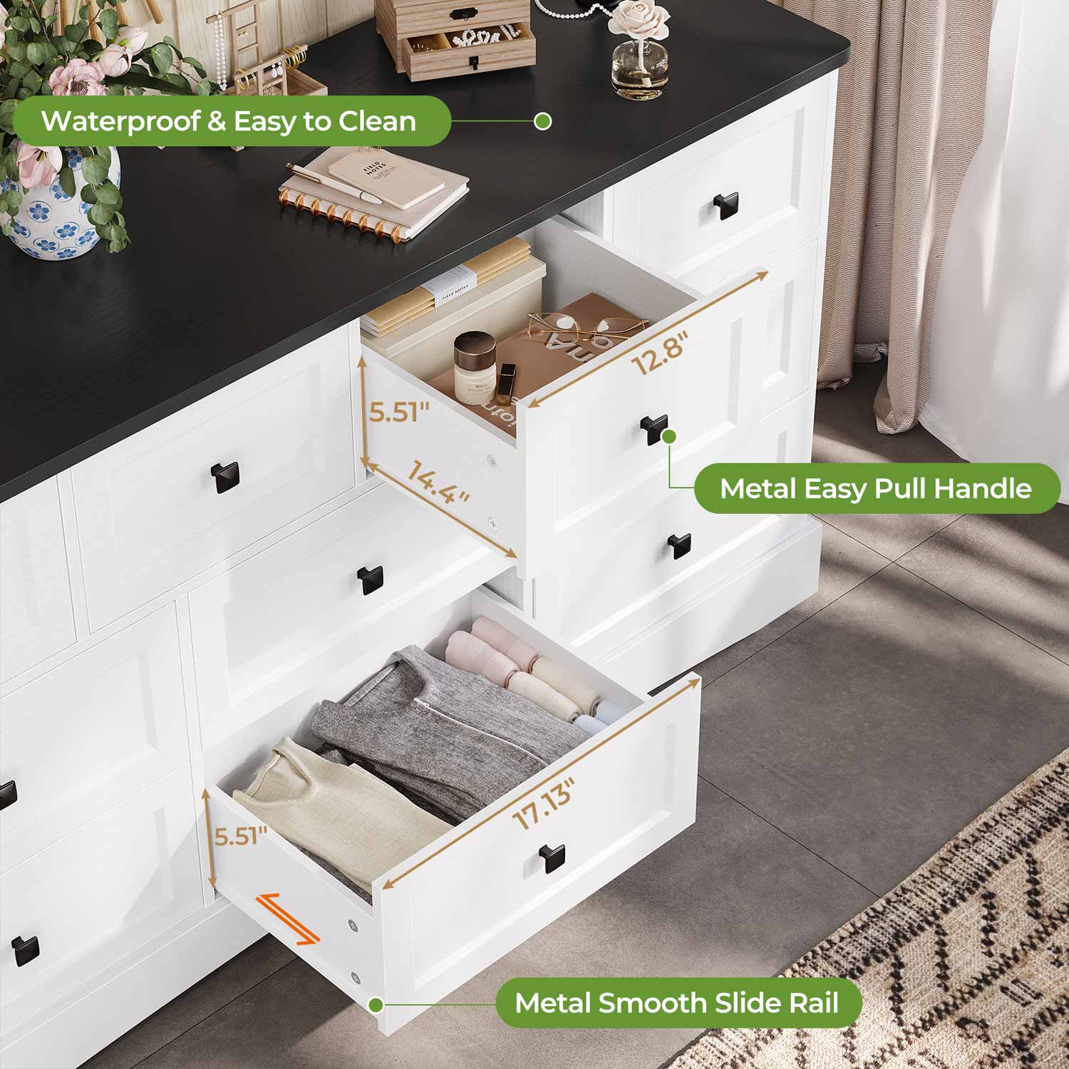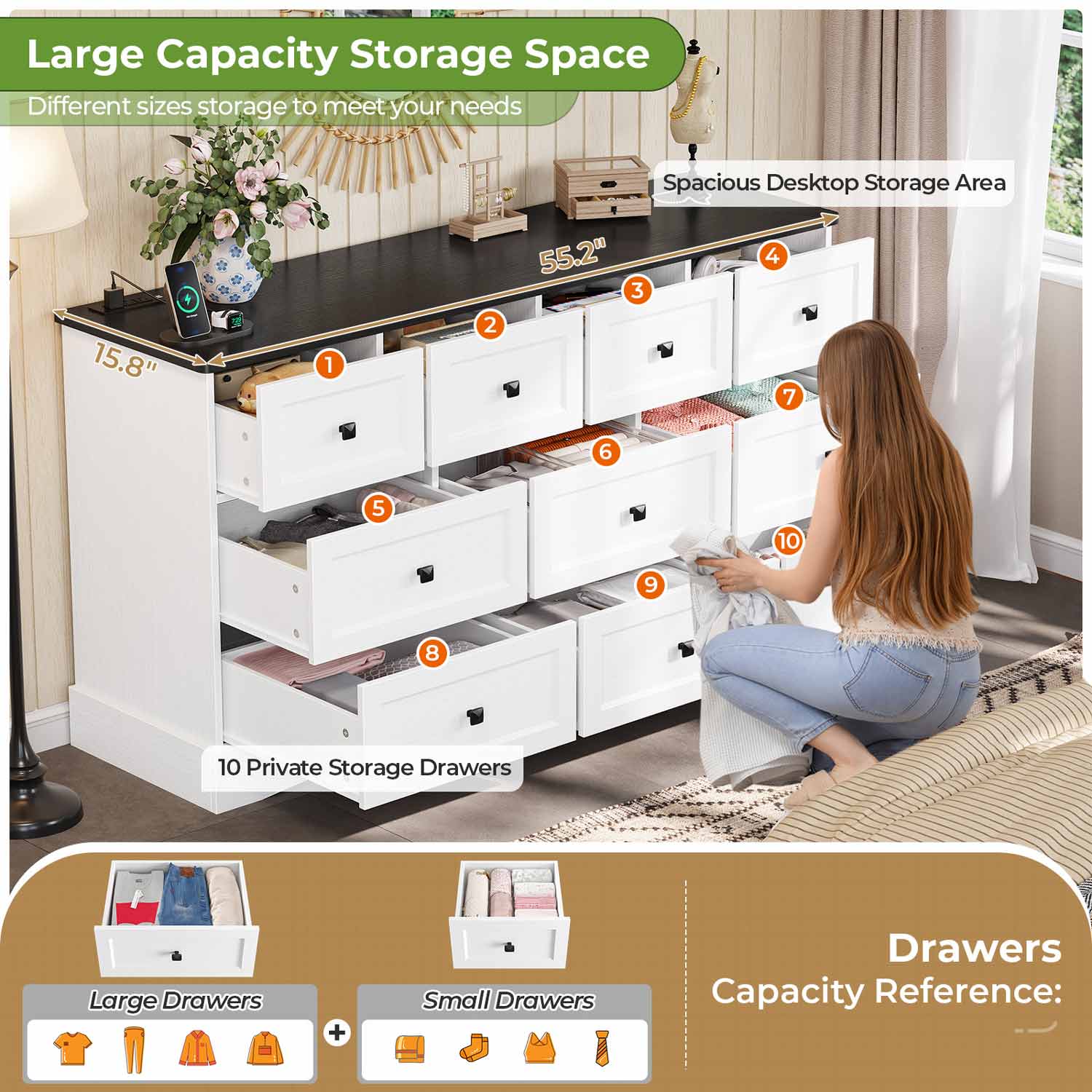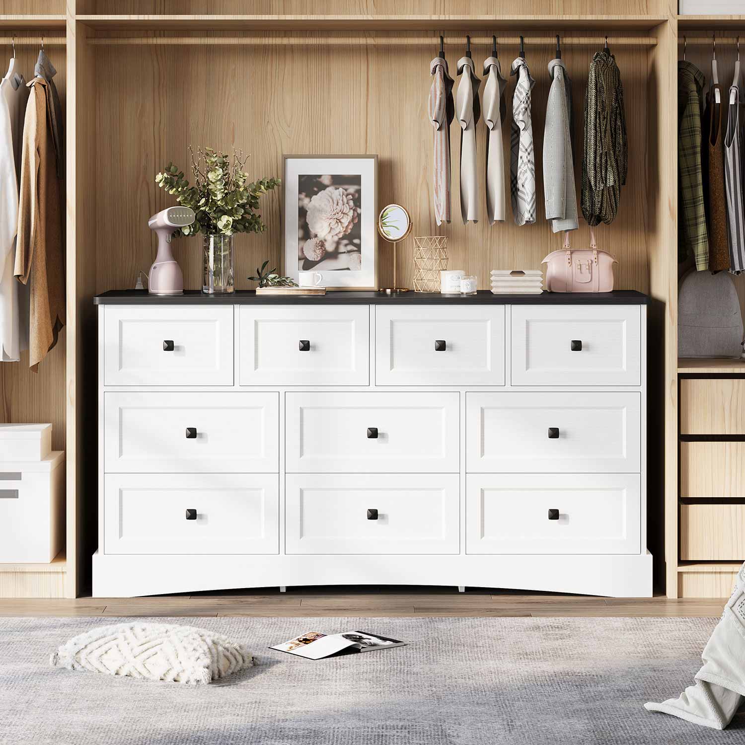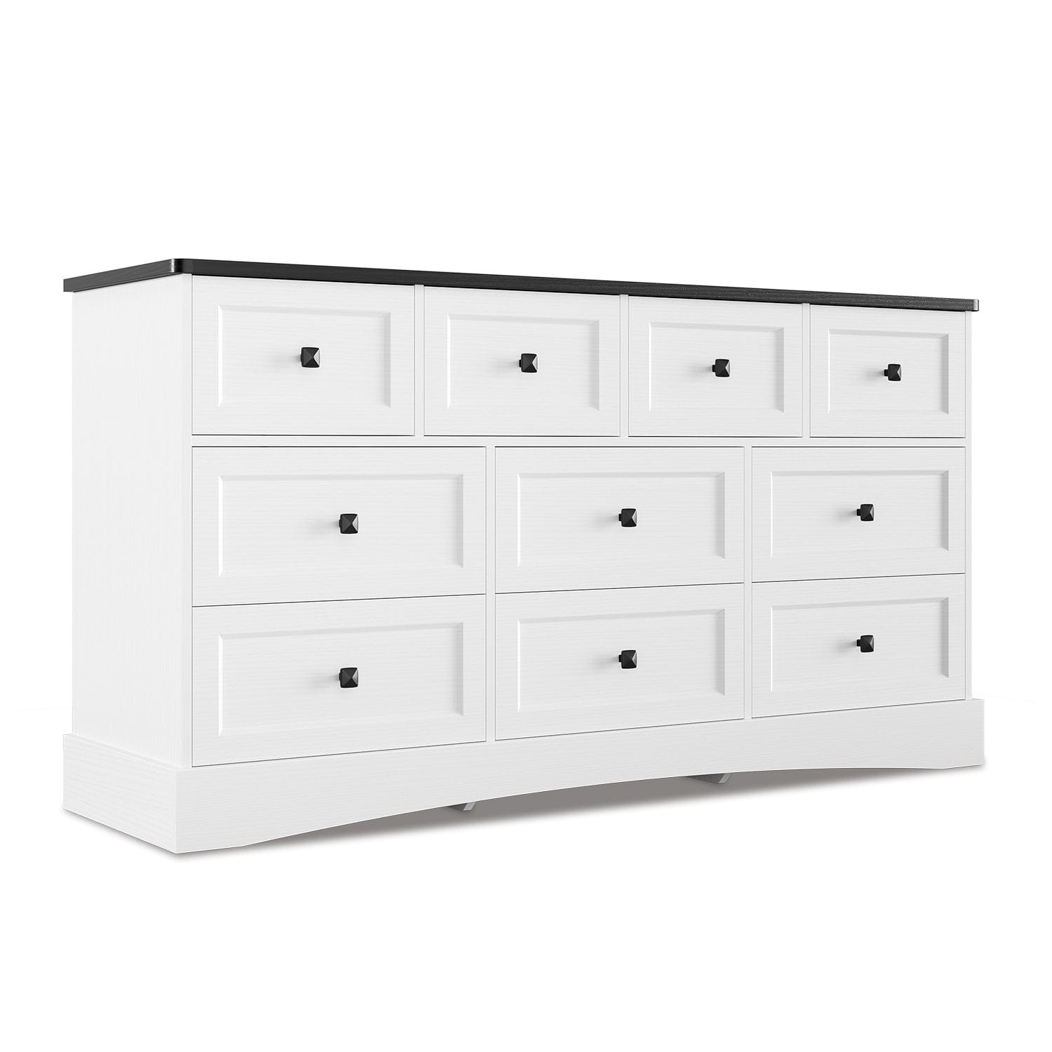 Featuring six roomy large drawers complemented by four compact drawers, this black bedroom dresser enables efficient categorization of diverse possessions. Ideal for growing families seeking to organize garments, toys, linens, and personal items, the configuration accommodates items of varying dimensions. The generous top surface performs dual functions as either a display platform for decorative objects, photographs, and botanicals or as a stable foundation for entertainment components.