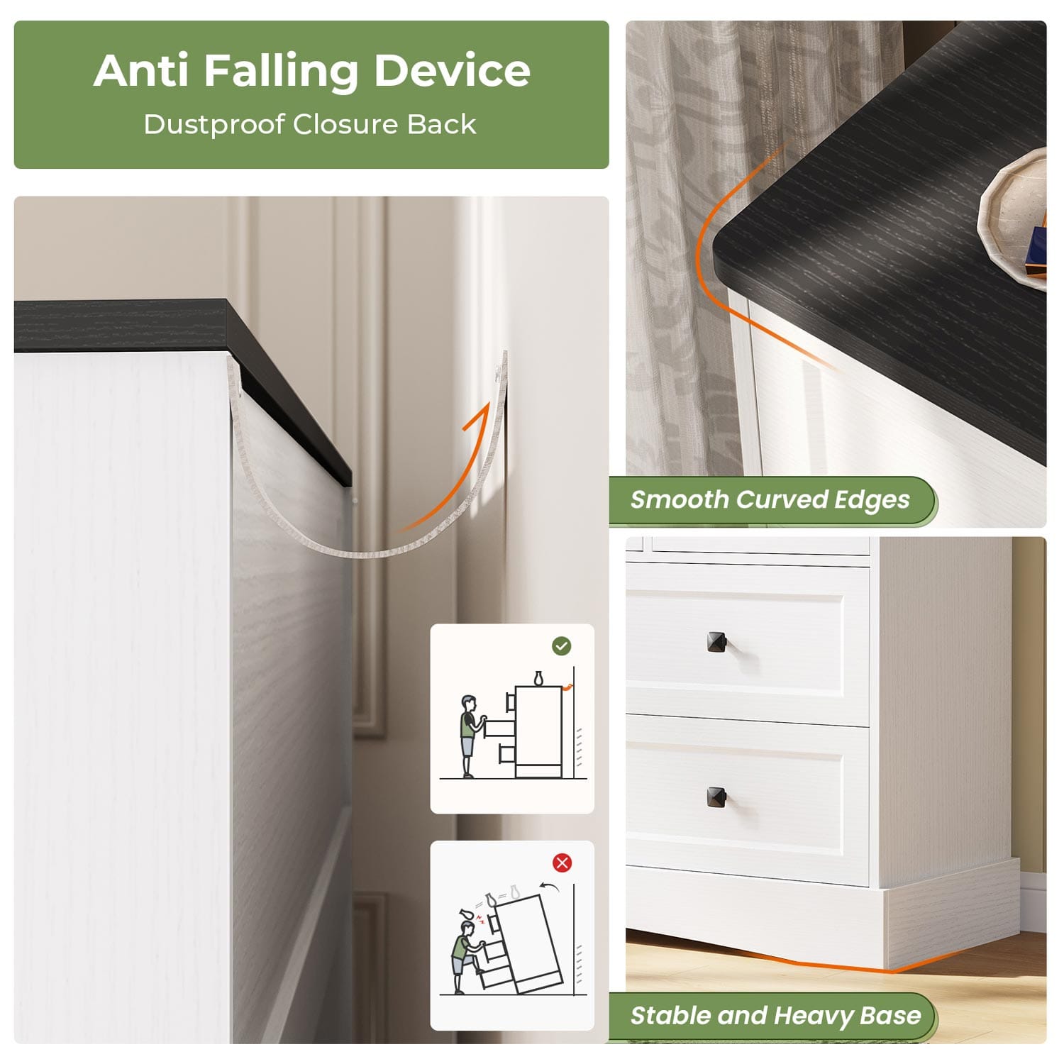 Manufactured from premium MDF engineered wood that resists warping and cracking, this dresser ensures long-term reliability. Drawers glide smoothly on quality metal runners with comfortable handles, while the reinforced back panel provides both privacy and structural integrity. Complete with anti-tip hardware and a stabilized base design featuring central support legs, the unit delivers exceptional durability and security for household use.