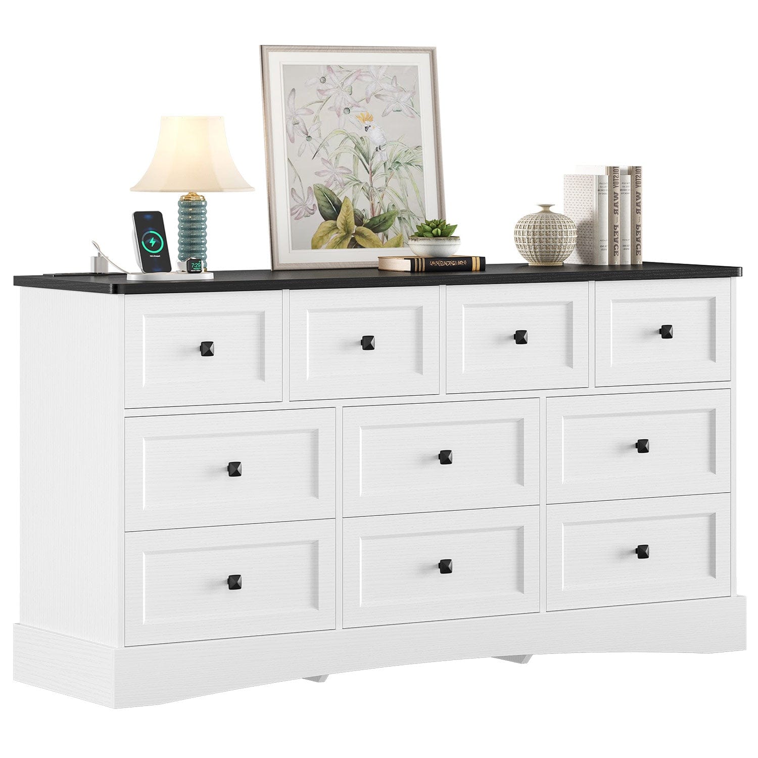 Sikaic Dresser 55.2 Inches Dresser with Charging Station White and Black White and Black / Engineered Wood / Farmhouse