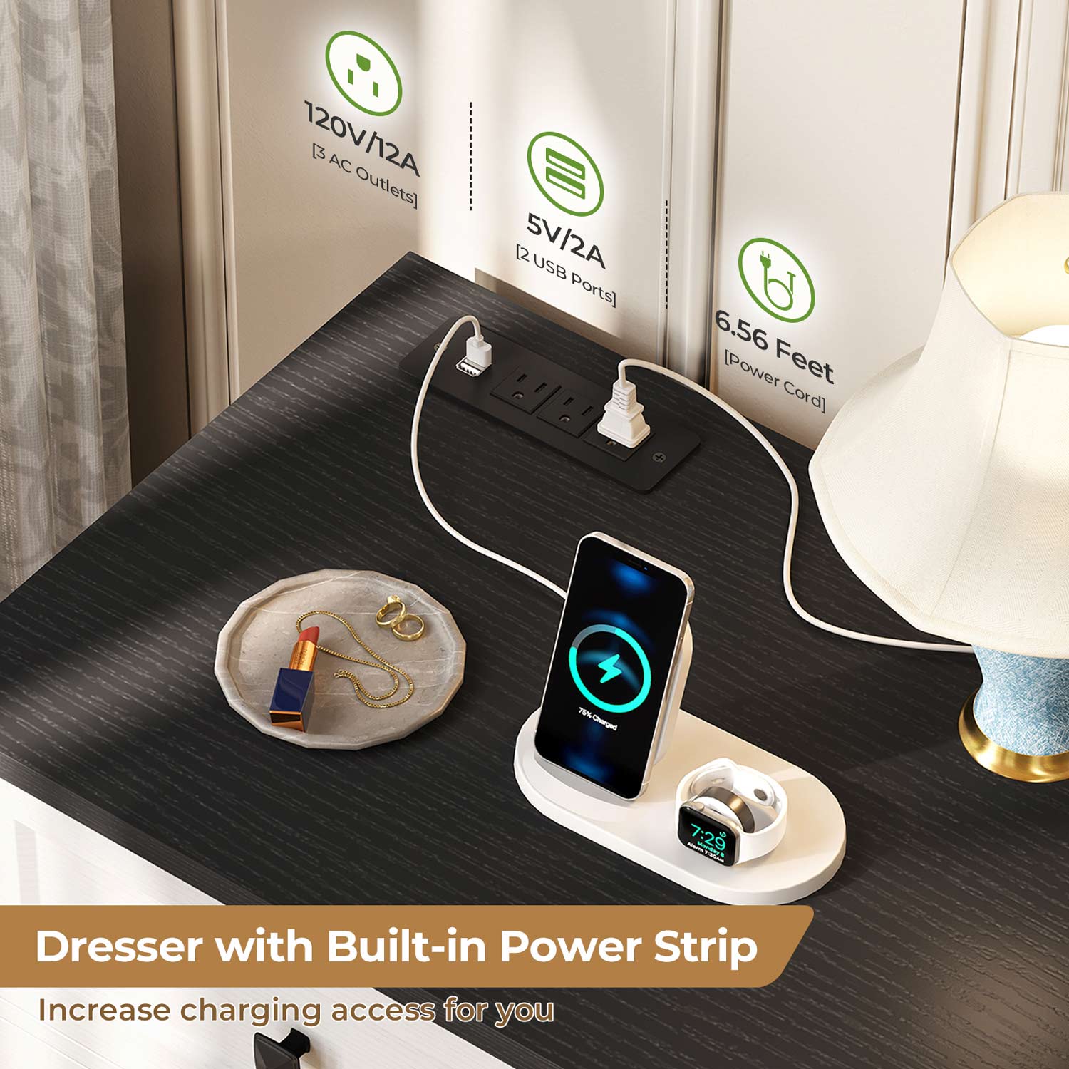 This wooden dresser incorporates a built-in electrical panel containing three AC outlets and two USB ports, facilitating convenient power access for lamps, mobile devices, audio equipment, beauty tools, and various electronics. Particularly valuable in spaces with limited wall outlets, the centralized power management system keeps cords consolidated behind the unit, preserving aesthetic appeal while optimizing spatial efficiency.
