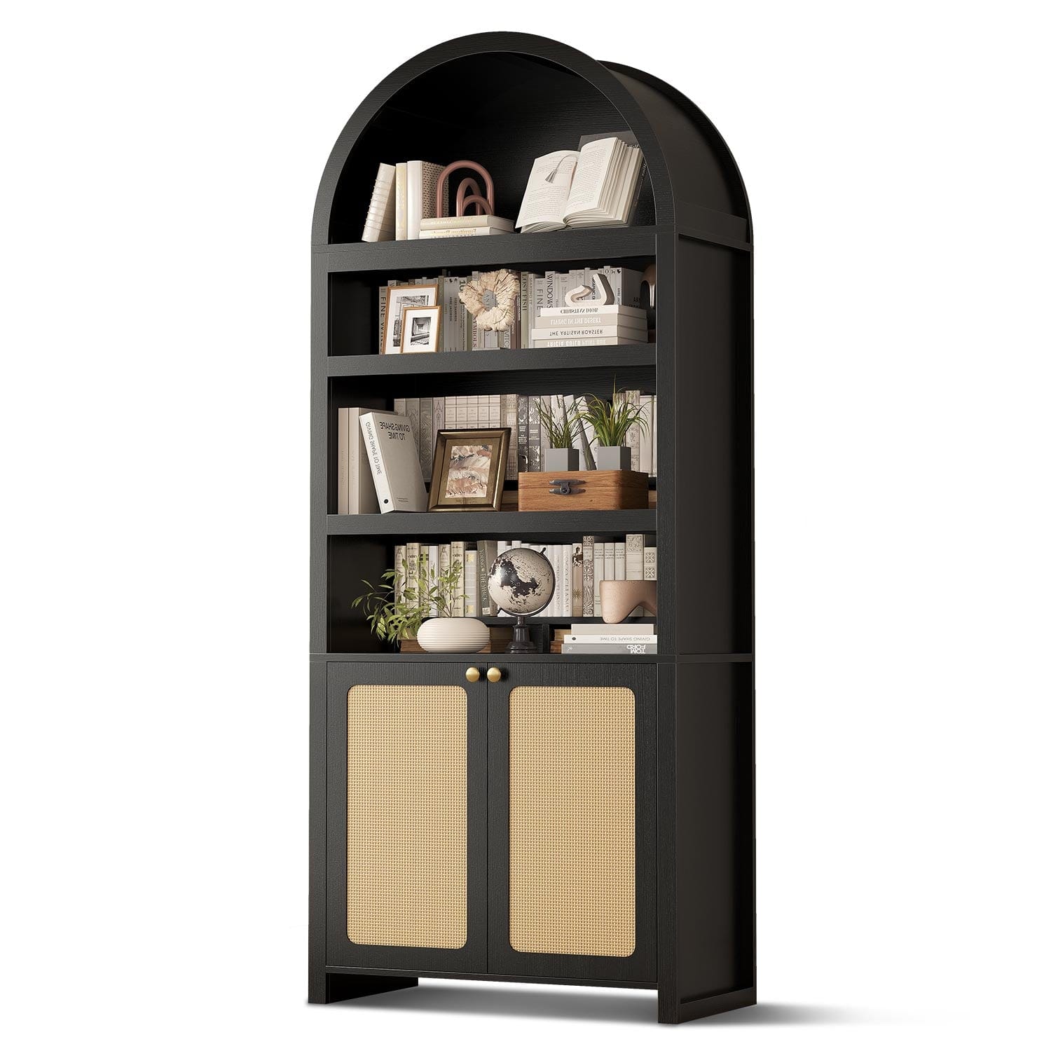 Designed with a gracefully curved cabinet crown and constructed from solid, robust panels, this bookcase delivers both reliable functionality and sophisticated visual appeal. The elegant arched silhouette introduces a touch of timeless class to any interior setting, enhancing your room's character with its structured yet graceful presence.