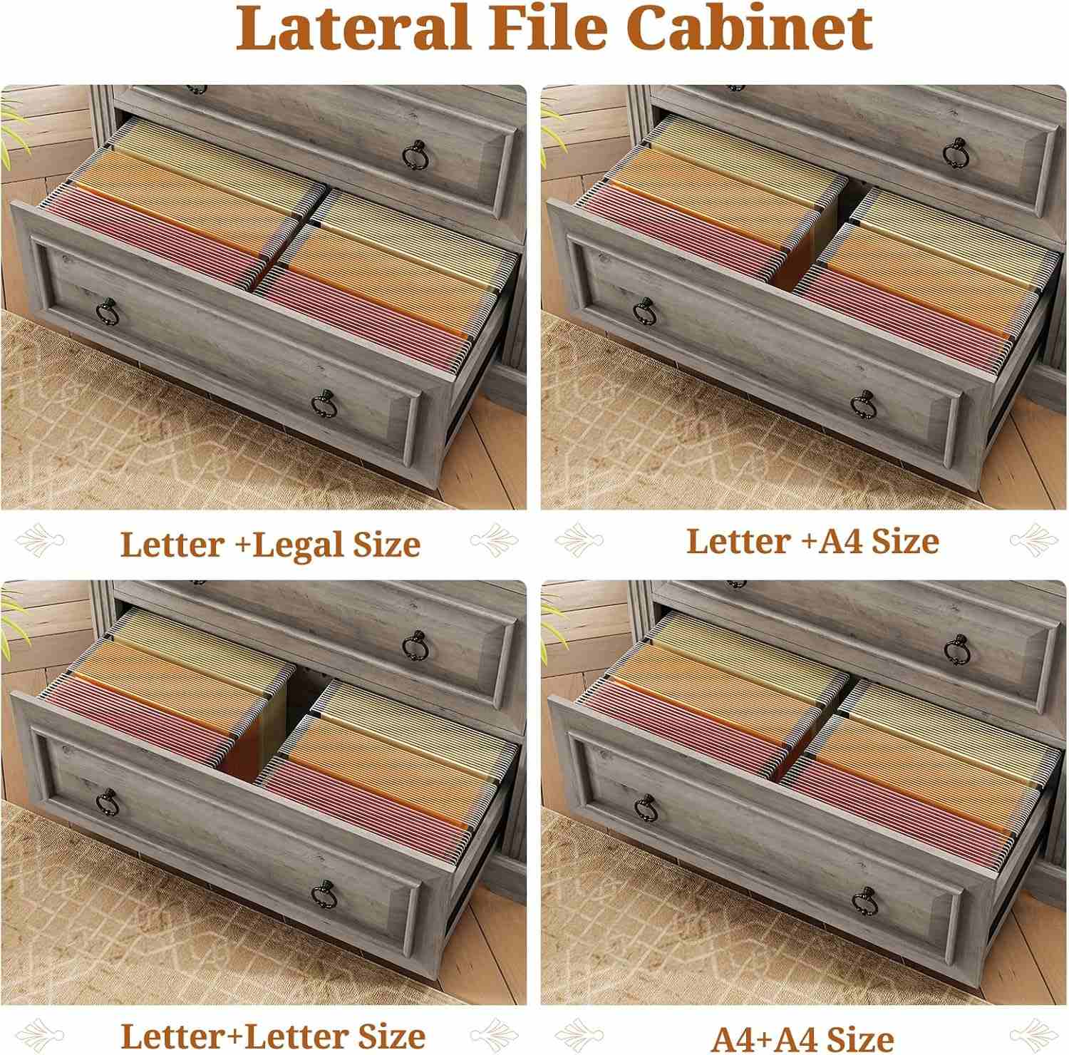 This lateral file cabinet is designed with two drawers that accommodate hanging letter, legal, and A4-size file folders, along with other essential home office items. Each drawer offers three adjustable depth settings, allowing you to customize the interior layout and select the appropriate hanging bar for legal, letter, or A4 formats. Ideal for home offices or workplace environments, this cabinet keeps important documents neatly organized and within easy reach.