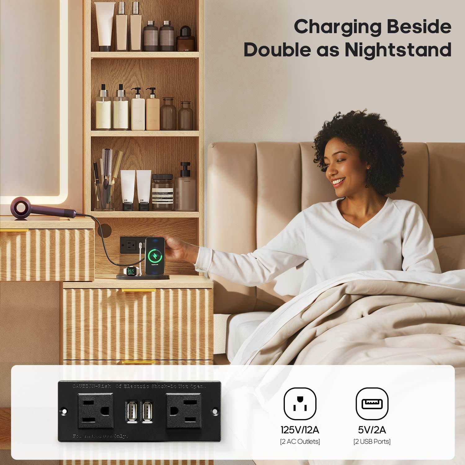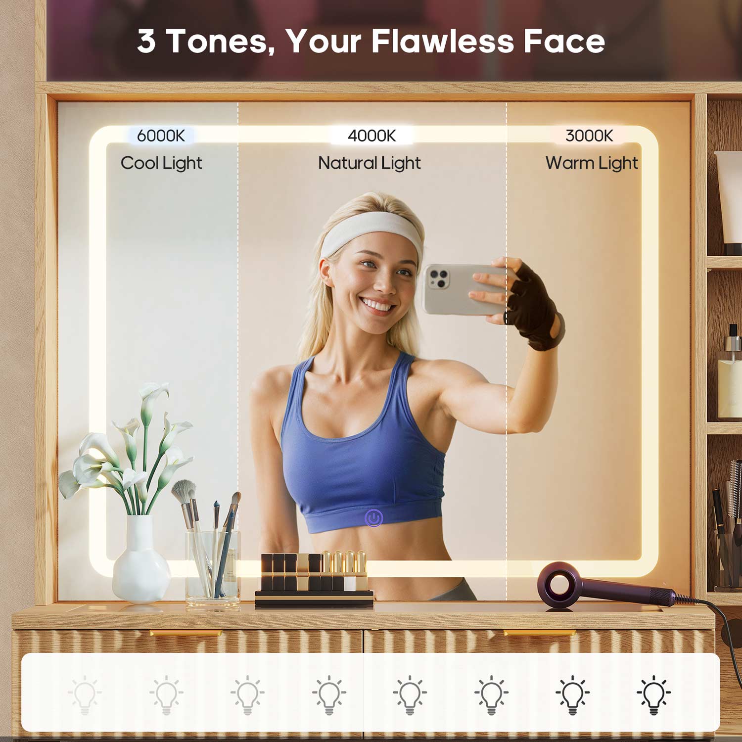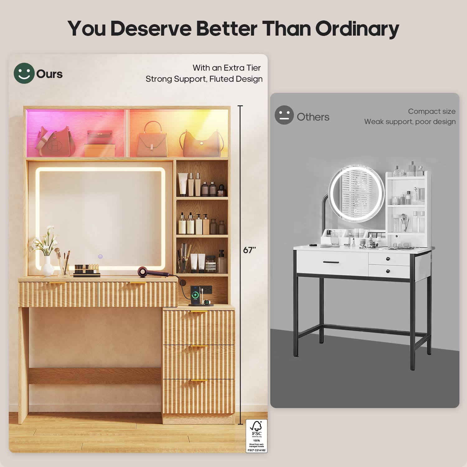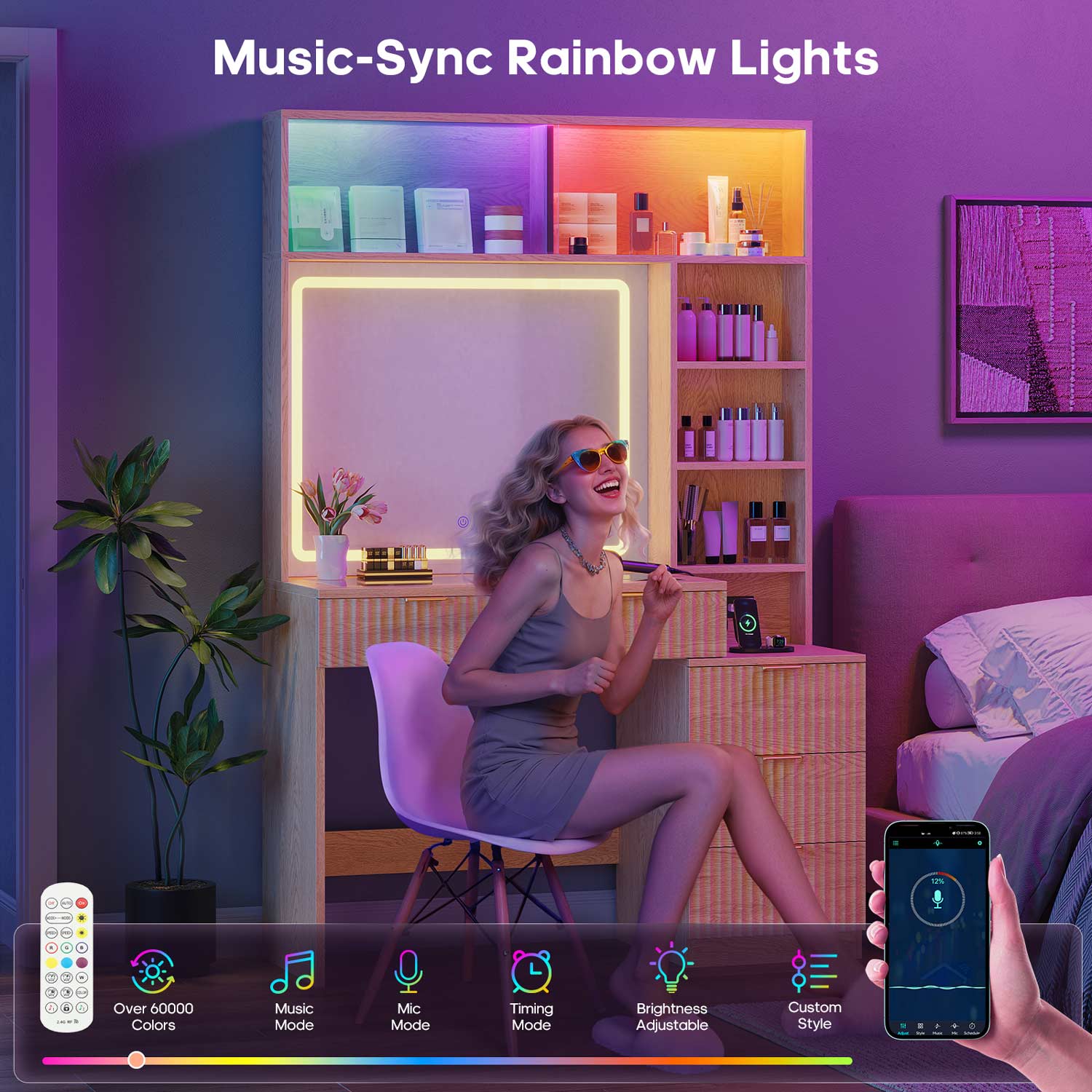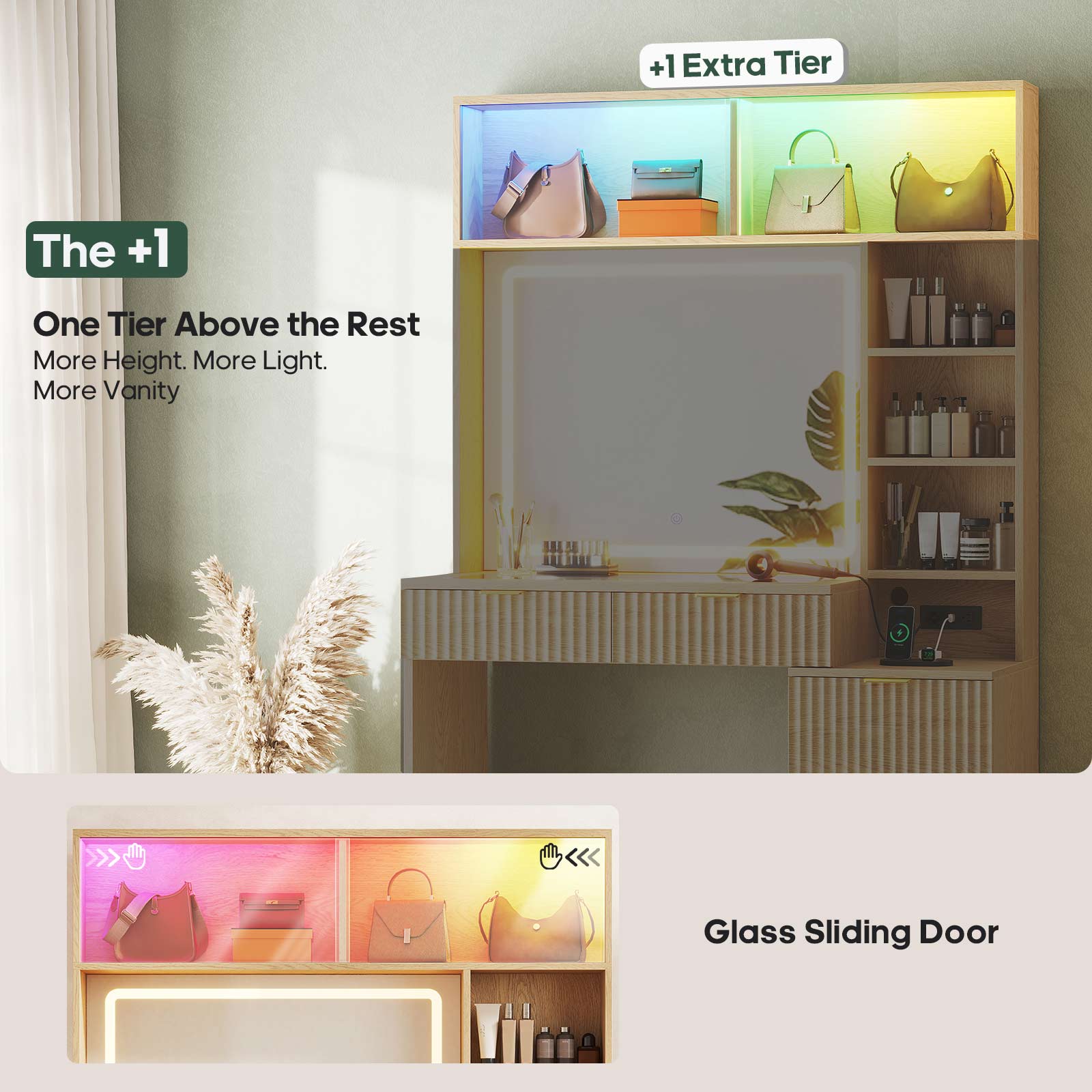 Fluted Makeup Vanity with Sync Music LED Lights and Glass Top Natural Oak
