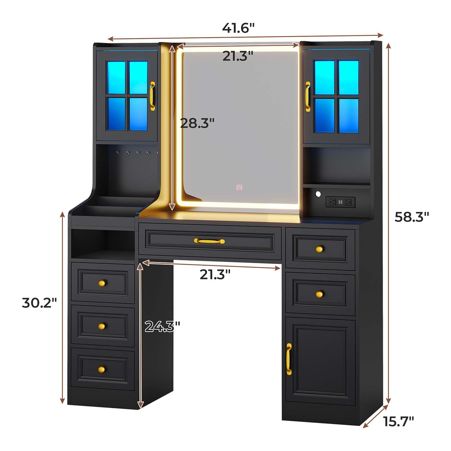 This vanity is a storage giant. With 6 drawers, 4 open shelves, 3 built-in desktop organizer, 5 jewelry hooks, 2 RGB cabinets with tempered glass shelf, 1 storage cabinet with adjustable shelf, it offers plenty of storage space and help you keep organized.