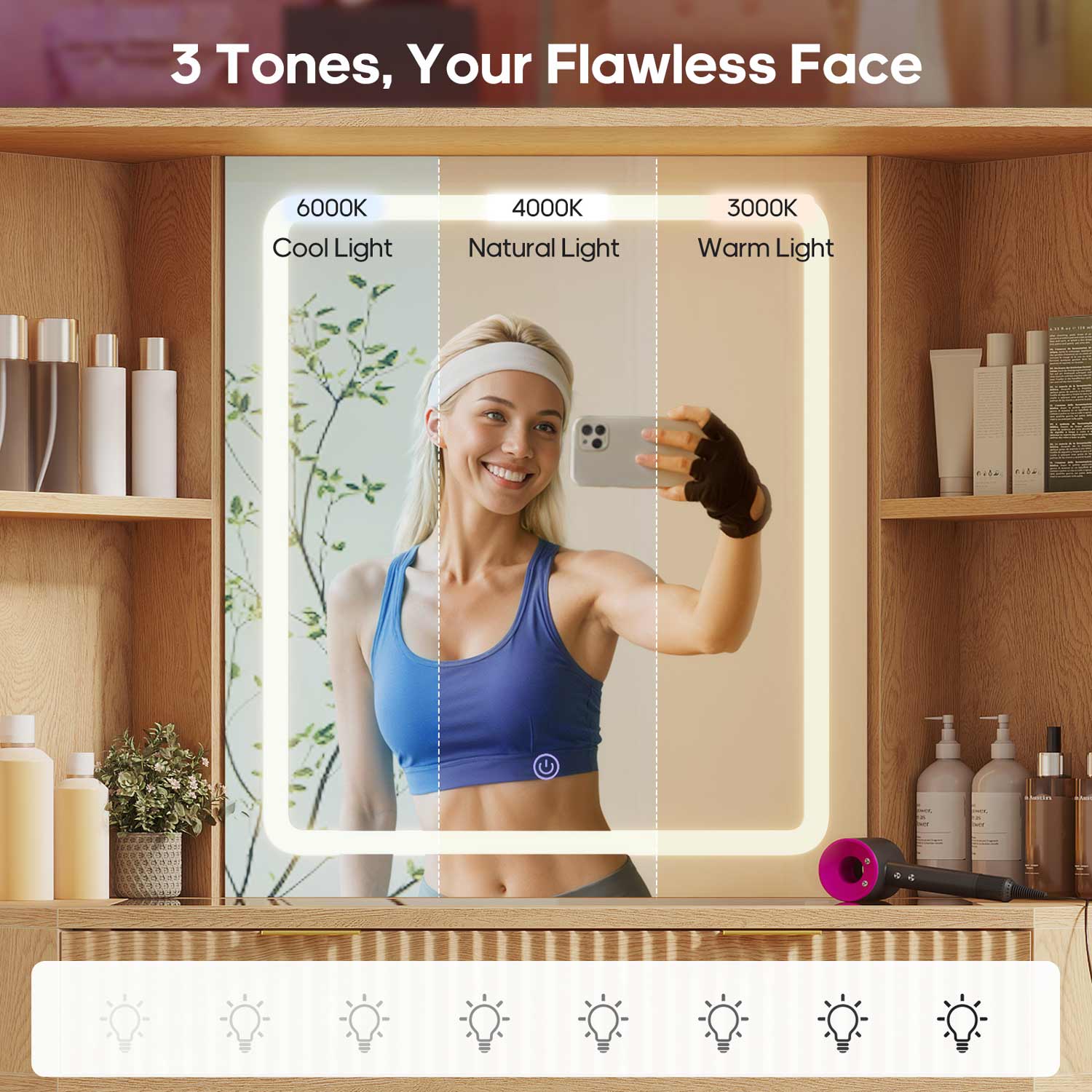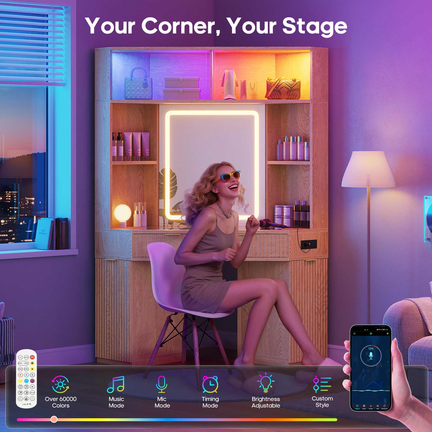 Makeup Vanity with Sound Sync LED Lights and Glass Top Natural Oak
