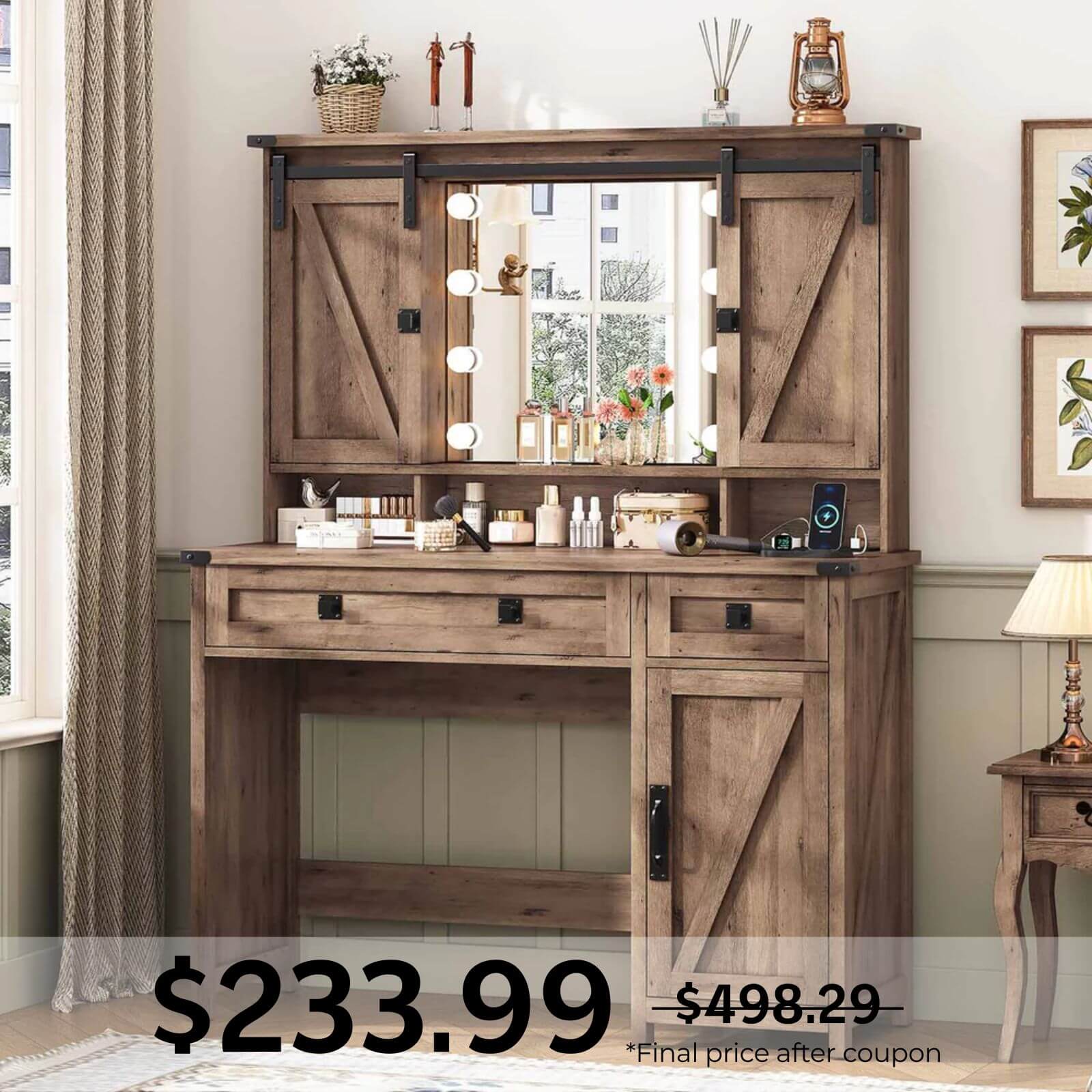 Makeup Vanity with LED Mirror Sliding Barn Doors Brown