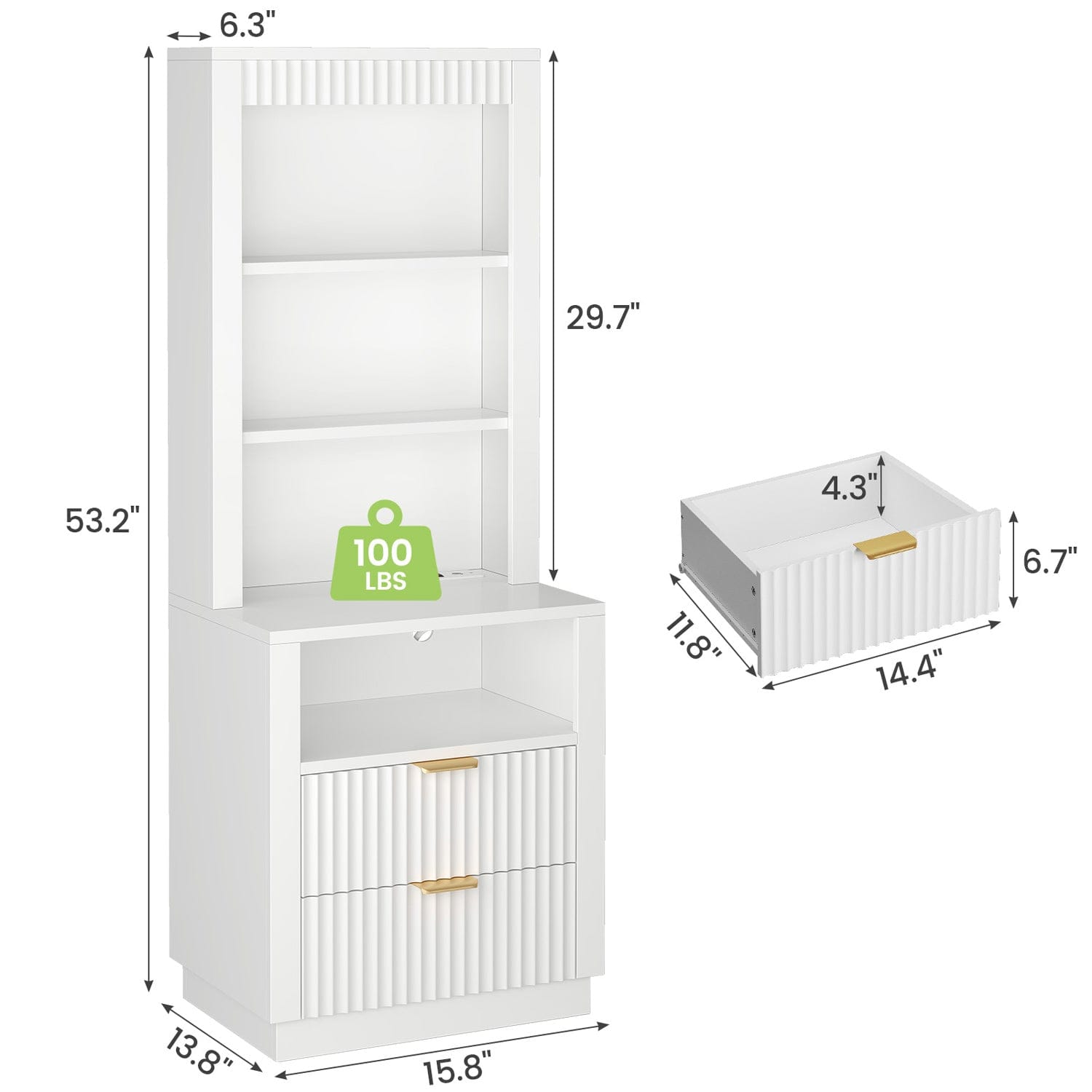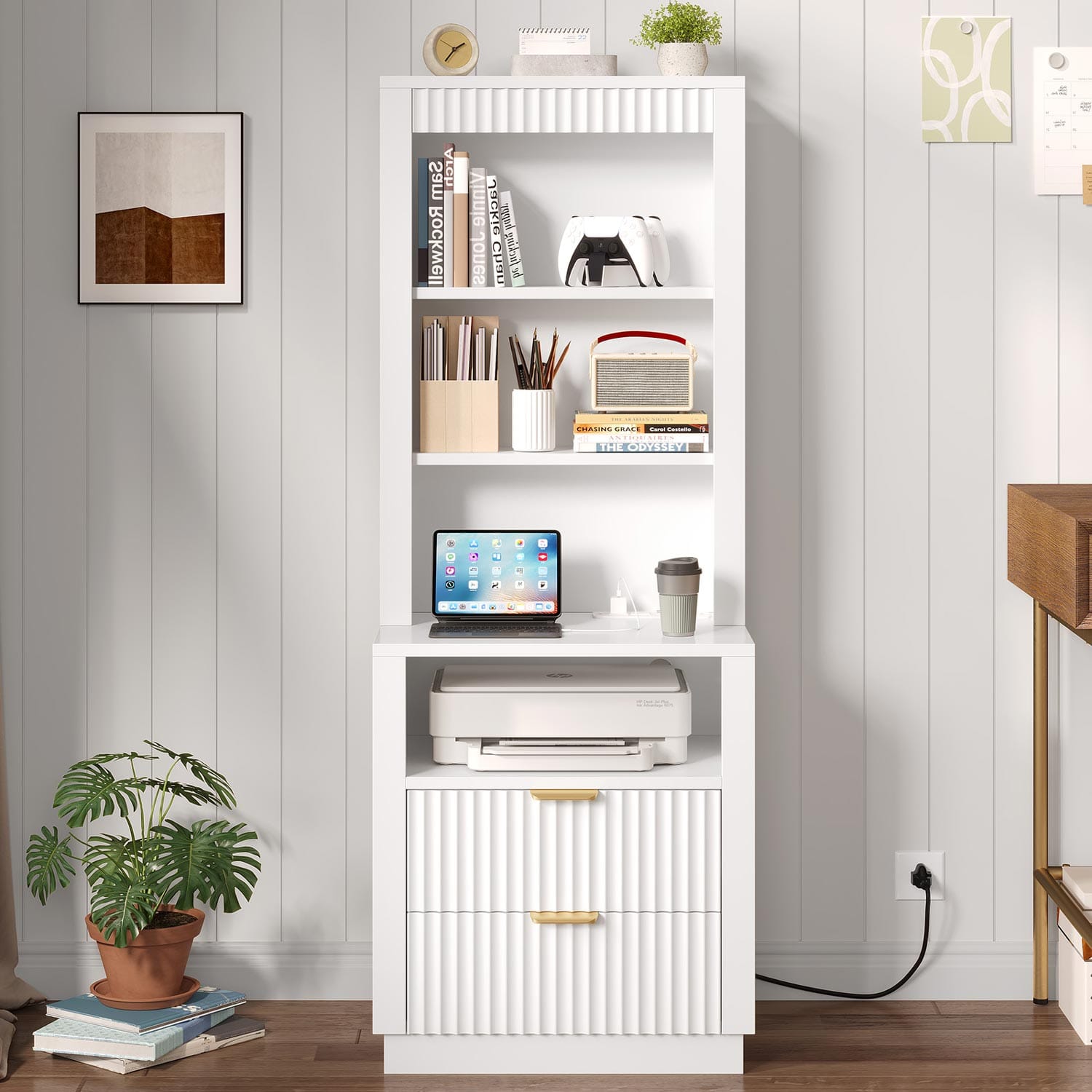Tall Fluted Nightstand with Drawers and Charging Station White