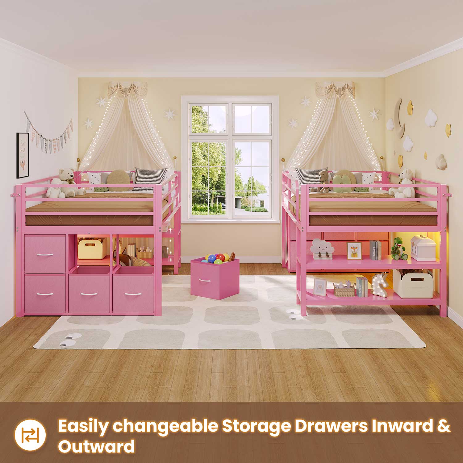 Sikaic Loft Bed Frame Twin Size Low Loft Bed with 6 Storage Drawers and LED Lights Pink Pink / Engineered Wood / Modern