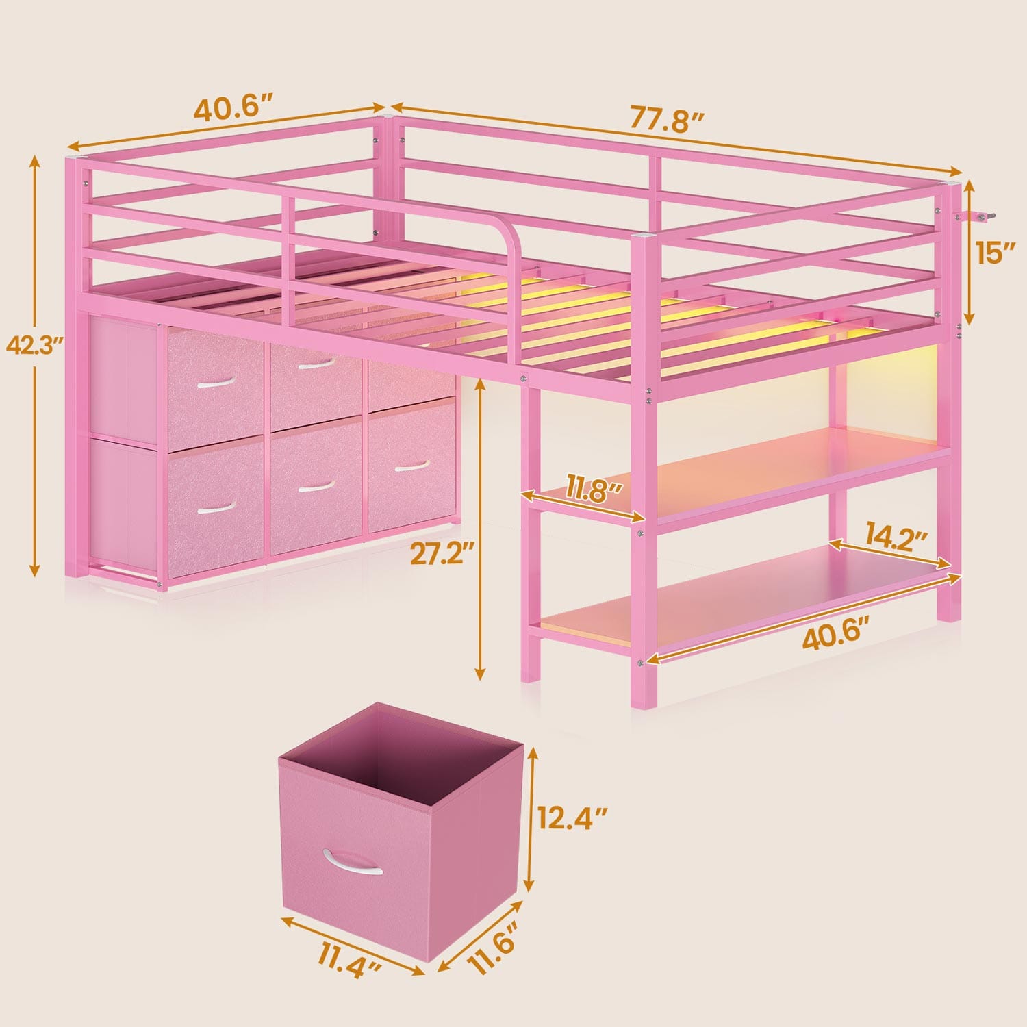 Twin Size Low Loft Bed with 6 Storage Drawers and LED Lights Pink
