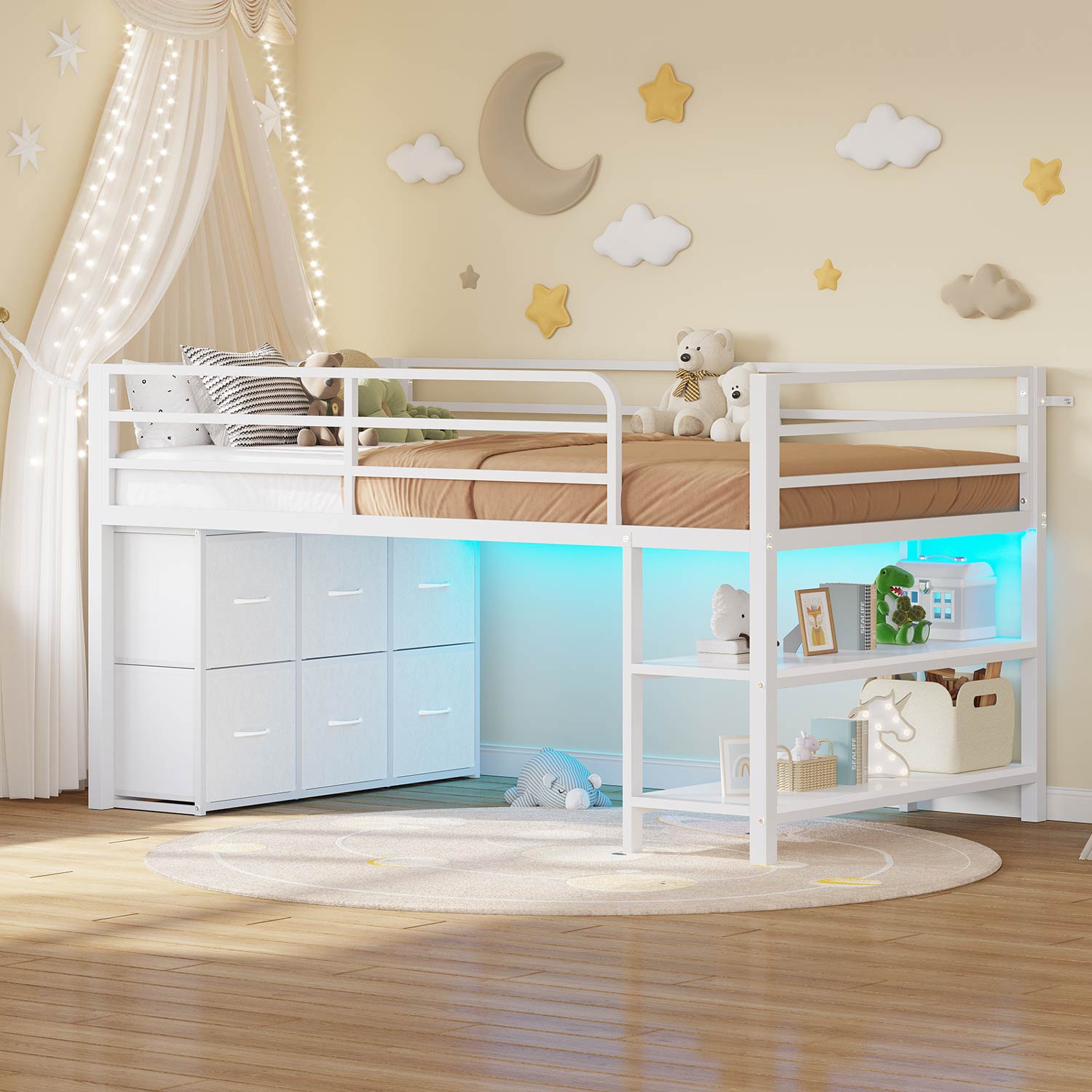 Offering six large fabric drawers and two tiers of open storage shelves, this loft bed provides ample space for organizing essentials, toys, blankets, books, and electronics. The open shelves are perfect for displaying photos, favorite reads, toys, or decorative items, while the enclosed under-bed area offers a secure, dedicated play zone—creating a tidy, multifunctional environment in your home.