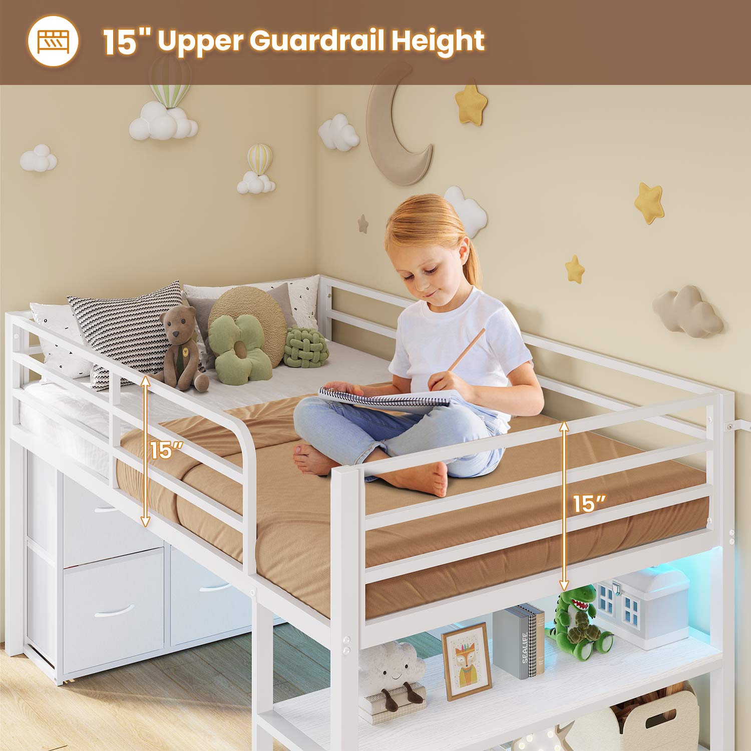 This twin loft bed features built-in vibrant LED light strips that can be conveniently controlled using a provided remote or dedicated smartphone app. Customize lighting modes and adjust brightness to create a cool aesthetic and a cozy modern atmosphere at night. The multi-functional, colorful illumination also brightens the under-bed play space, enhancing both fun and visibility for your children.