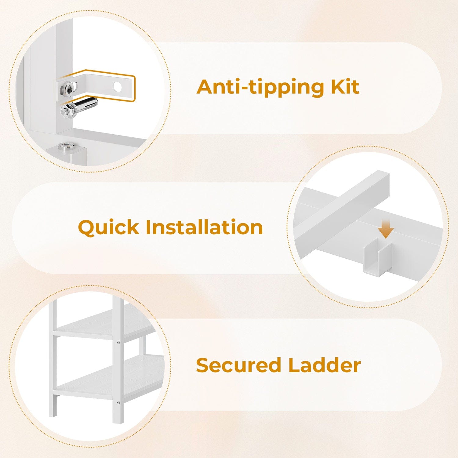 Designed with a 15-inch upper guardrail to prevent falls and ensure secure sleep, this bed provides peace of mind for parents. An attached ladder offers easy and safe access to the top bunk, while an included anti-tipping device adds further stability. Non-slip pads beneath the frame prevent sliding and protect your flooring.